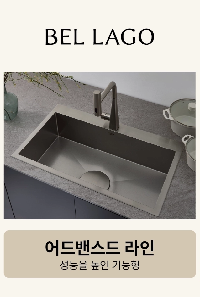 벨라고의 모든 싱크볼은 라인업과 관계없이 최고급 나노코팅이 기본 적용됩니다. 304 스테인리스 본연의 견고함 위에 특수 코팅을 더해 음식물 착색과 오염을 방지하고, 세균 번식을 억제하여 가족의 건강을 지킵니다.