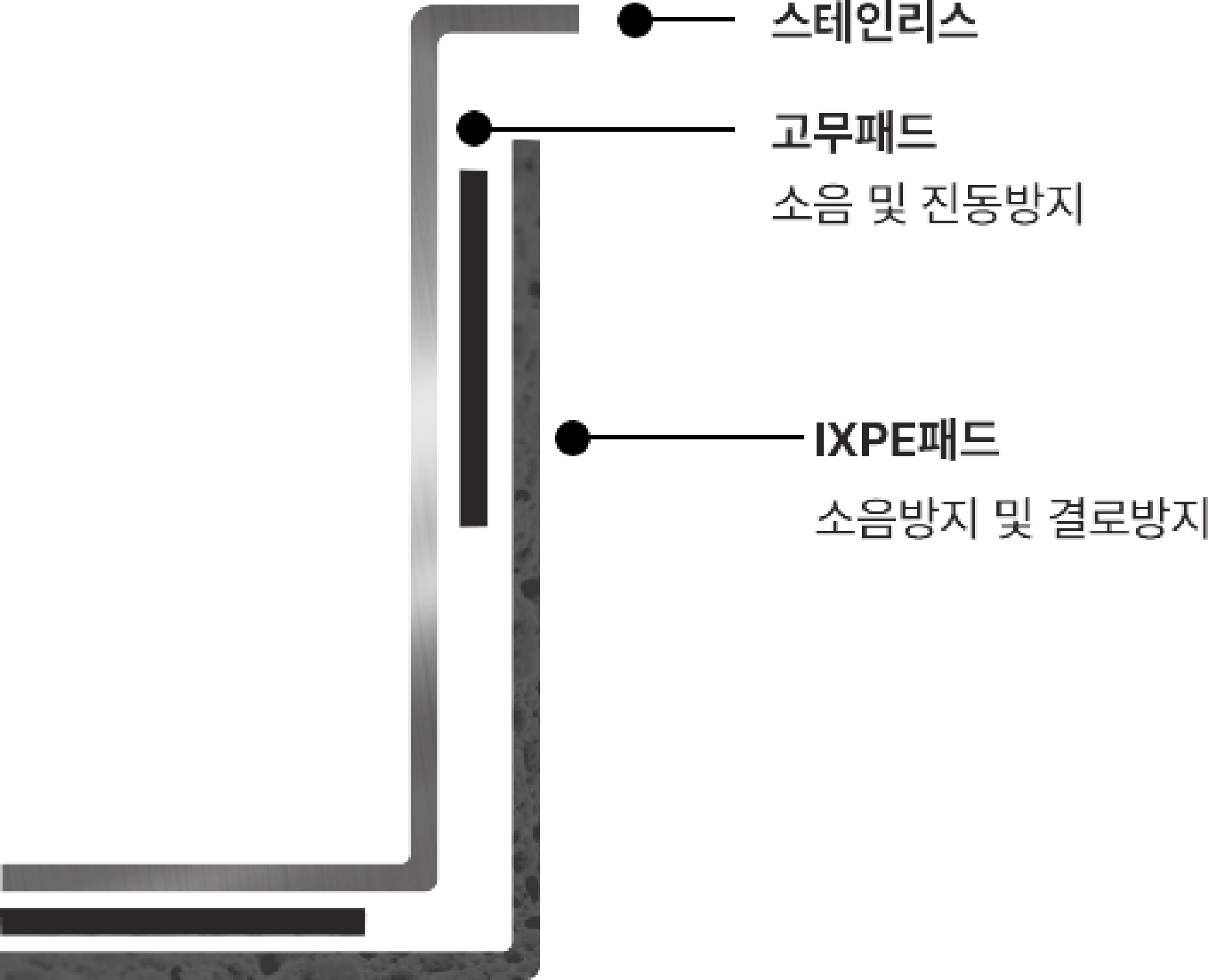 싱크볼 하단에 부착된 3중 방음 패드가 물 떨어지는 소음과 진동을 흡수하여 보다 정숙한 주방 환경을 조성합니다.